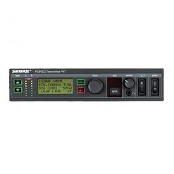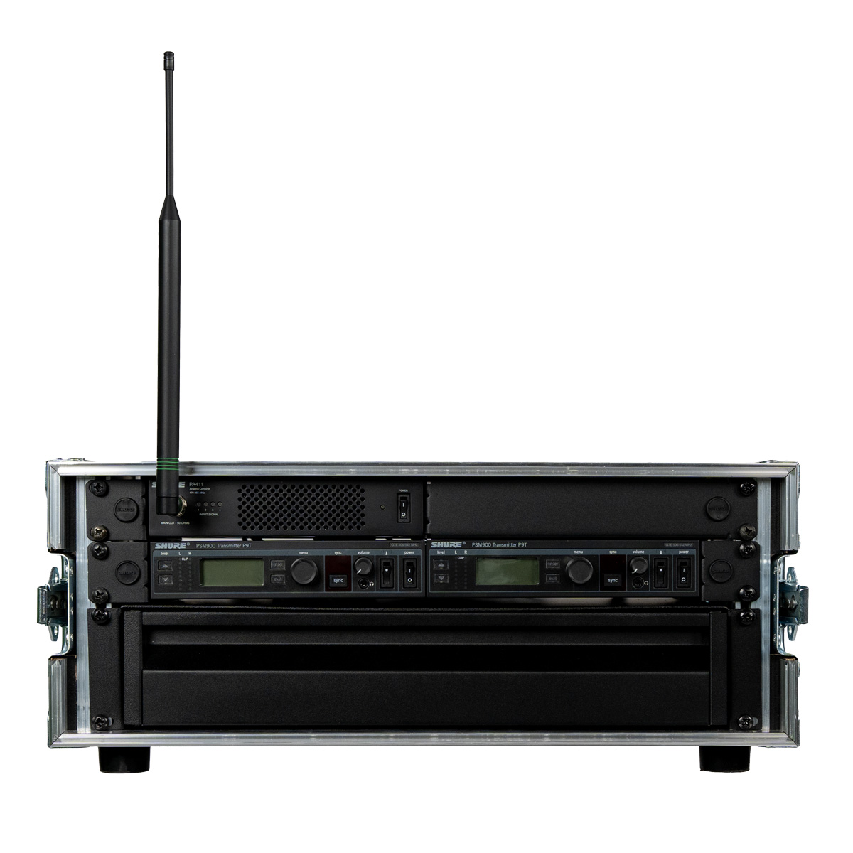 • System mit InEar Sender (Shure – PSM900 P9TE G7E), Taschenempfänger (Shure – PSM900 P9RA+ G7E), Antennenkombinierer (Shure – Shure PA411) und Zubehör